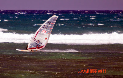 As sailors arrived at Spreckelsville they were greeted with 15 knots but it looked promising upwind. Most but not all competitors gambled that the wind would increase and rigged 6.0m to 6.5m sails. Not long after the course opened at 11am the wind had built to 25 knots as expected. What wasn’t expected was the larger than normal summer swell and the reef protecting the course was going off, well if you were riding your wave gear. Six to eight foot ramps were rolling in which made for some sketchy moments as sailors headed back through the break and upwind at the end of their run.